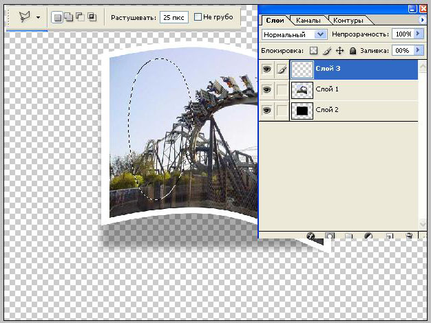 12. Создаем новый слой, расположив его в самом верху в панели слоев. Инструментом Polygonal Lasso, установив параметр растушевки (feather) около 25 px, делаем овальное выделение