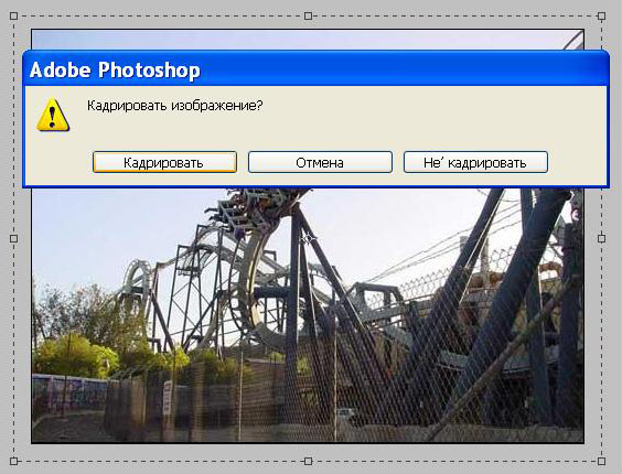3. Когда выделение сделано, то удерживая клавиши Shift и Alt, подводим курсор к угловому квадратику выделения и начинаем его растягиватьза пределы фотографии, при этом выделение растягивается равномерно со всех сторон. Когда расстянули на достаточное расстояние - нажимаем Enter. Выскакивает окошко и мы соглашаемся кадрировать